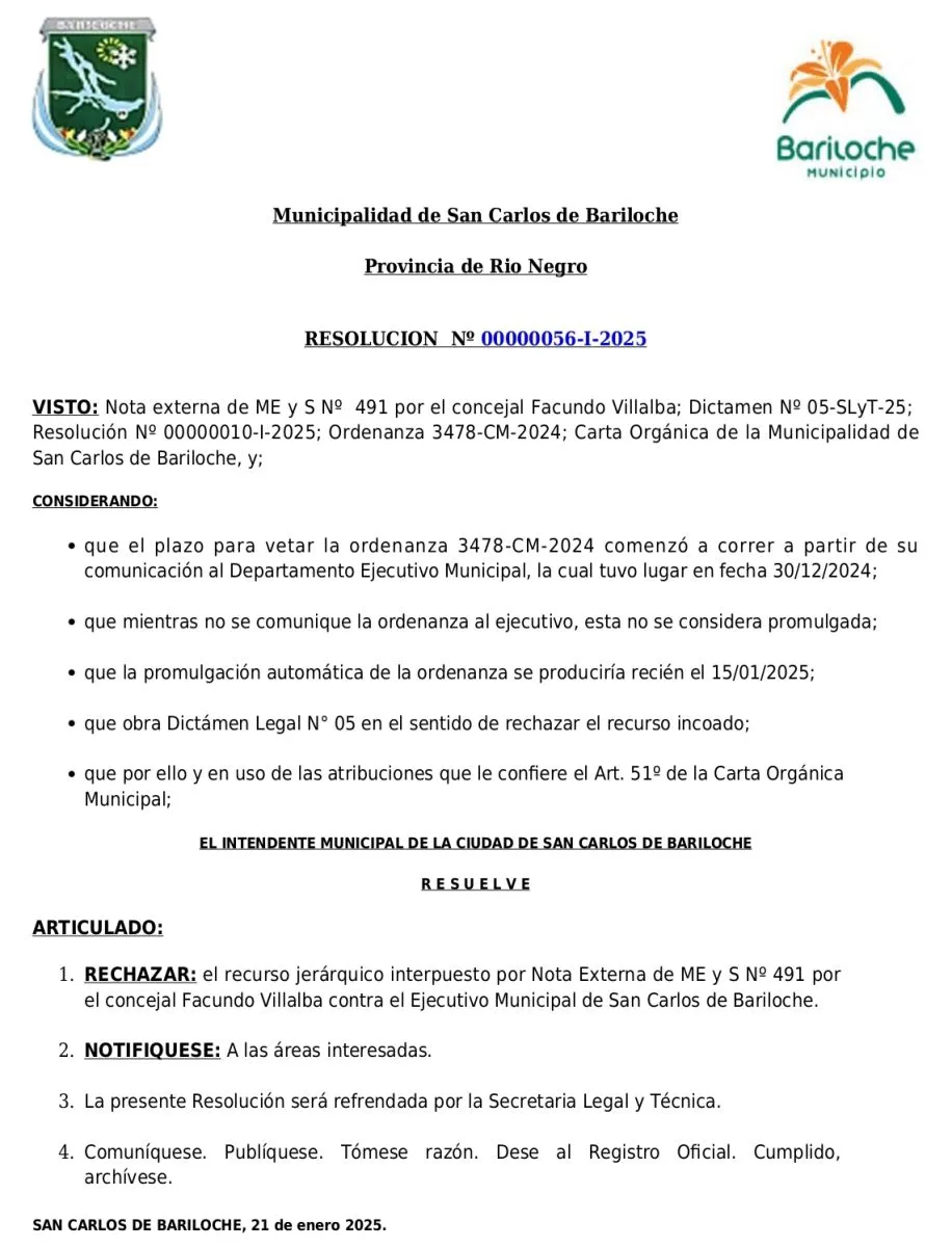 El intendente Walter Cortés rechazó un recurso interpuesto por el concejal Facundo Villalba contra el Ejecutivo Municipal de San Carlos de Bariloche, una presentación en la que entendía que el jefe comunal había vetado fuera de término la ordenanza que regula la pauta publicitaria oficial.